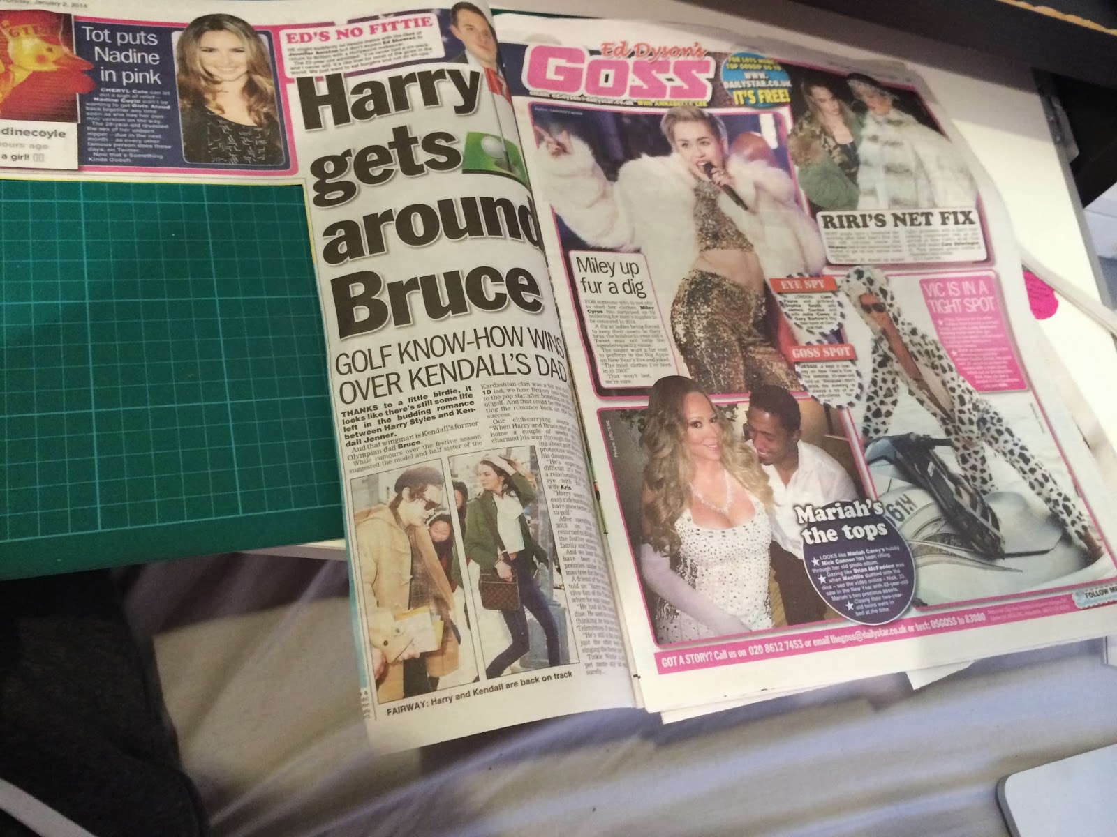 Here is a photo off a spread in the daily star dedicated to celebrity gossip and in typical gossip magazine style garish colors and a huge collection of font styles no set type families are used just 10 different font's 1 been Digital "Sale" in the EE magazine, oblique block style font used in the "Goss" header, a stencil style digital font used in the "eye spy" and "goss spot" circles, Bold sans serif used in "Harry gets around bruce" title, round serifed roman font used in "RIRIS NET FIX" & "EDS NO FITTIE" in uppercase and "Mariahs the tops" lowercase. The body copy combines bold sans serif, serif regular and regular sans serifs. A script style font is used in the "Ed dyson" header in italic form and the rest off the smaller details is made up off miss matches of past used fonts in the obvious visual texts.