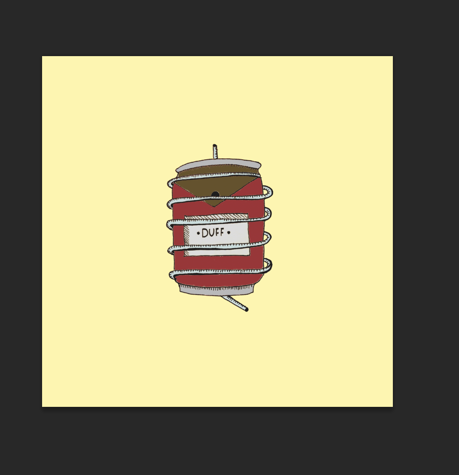 I felt a Duff can suited better as it denoted homer more who is the key character of the show. I created a very minimal visual of the can to simulate Jakes stripped back style while using pastel tertiary colors to create a more traditional overall feel. The idea of presenting a beer can has vague social connotations off youth culture and drinking which has loose links with Jakes urban upbringing.
