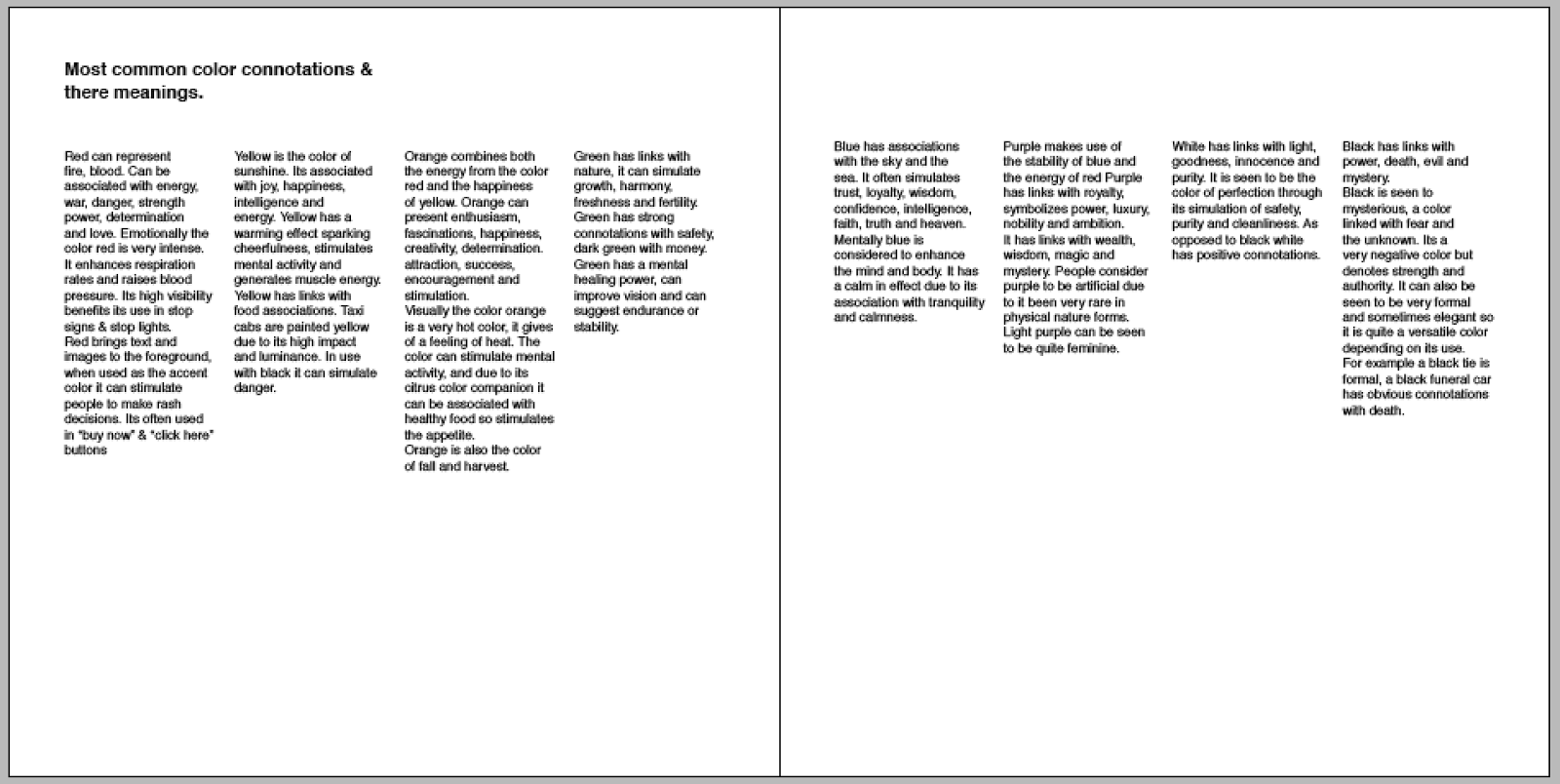 So I sketched out the type in order of paragraph length so it sort of tapered off over the spreads, this looked a lot better and create a better balance between used space and negative space, the colors would be simply aligned flush with each paragraph/body of text.